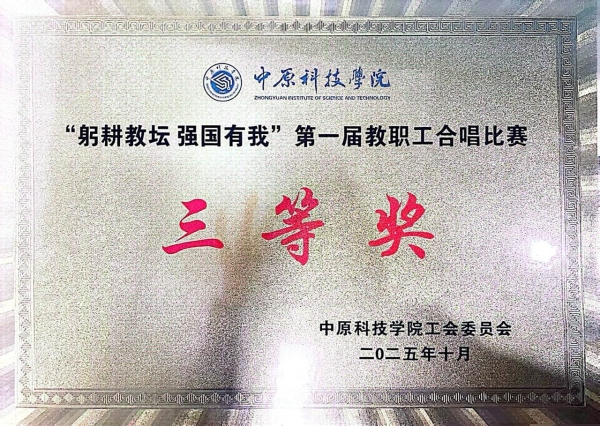 在10月23日举行的中原科技学院"躬耕教坛,强国有我"第一届教职工合唱比赛中,我院代表队凭借出色的表现荣获三等奖,展现了学院师生自强不息,追求卓越的精神风貌。