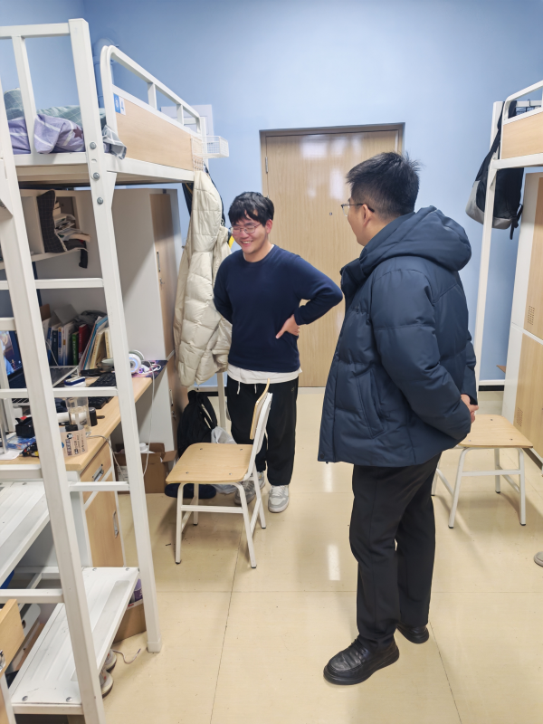 2026年1月1日,为落实学校关于元旦假期安全稳定工作的部署,学院党总支书记丁鹏元带领辅导员组织开展学生宿舍走访活动,向暂未离校的学生传递节日问候与学院关怀。走访过程中,学院党总支书记丁鹏元与辅导员一同深入学生宿舍,与同学们亲切交流,提醒同